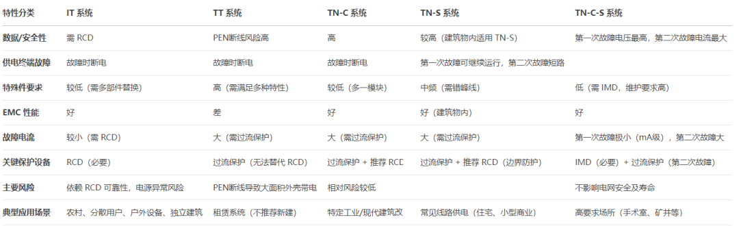 优点:设备外壳电位低:当设备发生单相碰壳故障时,故障电流流经设备接地电阻和电源接地电阻形成的回路。只要设备接地良好(接地电阻足够小),设备外壳对地电压可以限制在较低的安全范围内(通常要求小于50V)。故障电压不蔓延:一个设备的接地故障不会导致其他设备外壳出现危险电压(因为它们各自独立接地)。电磁兼容性好:N线和PE线分开,正常工作时PE线无电流,干扰较小。缺点:故障电流较小:故障回路阻抗较大(包含两个接地电阻),导致单相接地故障电流相对较小。依赖剩余电流保护:较小的故障电流可能不足以使过电流保护装置(熔断器、断路器)快速可靠动作切断电源。因此必须配合使用剩余电流动作保护装置(RCD,俗称漏电保护器)来检测和切断故障回路。需要良好的局部接地:每个设备或建筑需要建立自己有效的接地装置,并保证较低的接地电阻(通常要求≤4Ω),这在土壤电阻率高的地区可能比较困难或成本较高。应用场景: 广泛应用于农村、分散用户、户外用电设备、由公共电网(通常为TT系统)供电的独立建筑物。也常用于对电磁干扰敏感的场所。电源端直接接地,设备外露可导电部分通过保护导体(PE线或PEN线)连接到电源端的接地点。根据中性线(N线)和保护线(PE线)的组合方式,又分为三种子类型:整个系统中,保护线(PE)和中性线(N)合二为一,称为PEN线。优点:节省导线:只需四根线(三相:L1, L2, L3, PEN;单相:L, PEN),比TN-S少一根线。缺点:PEN线断线风险高:如果PEN线断线,断点后所有接PEN线的设备外壳将带上危险的相电压(接近220V),极易造成触电事故,危害极大。设备外壳可能带电位:正常工作时,PEN线中有不平衡电流流过,会导致设备外壳对地有一定的电压(几伏到几十伏),可能引起电击或对敏感设备造成干扰。无法安装RCD:因为PEN线同时承担N线和PE线功能,无法区分正常的工作电流和故障漏电流,所以通常不能直接安装RCD(除非采用特殊的三极四线RCD,应用受限)。保护措施: 主要依靠过电流保护装置(熔断器、断路器)。要求故障电流足够大以使保护装置快速动作。应用场景: 由于安全性较低,在现代民用建筑和新建工程中已逐渐被淘汰,主要存在于一些老旧建筑或特定工业场合(需严格保证PEN线连续可靠)。1)结构特点:整个系统中,保护线(PE)和中性线(N)严格分开。电源端中性点接地后,引出N线和PE线(通常由同一接地点引出)。优点:安全性高:PE线在正常工作时无电流通过(N线承载不平衡电流),设备外壳电位接近地电位,安全性好。故障电压不蔓延:PE线专用于故障电流,可靠性高。一个设备的故障不会通过PE线将危险电压传导给其他设备。便于安装RCD:可以方便地在相线和N线上安装RCD(监测两者电流矢量和),提供灵敏的附加保护。PEN断线风险消除:不存在TN-C系统的PEN断线导致大面积设备外壳带电的危险。缺点:导线用量多:比TN-C多一根导线(三相:L1, L2, L3, N, PE;单相:L, N, PE),成本较高。保护措施: 主要依靠过电流保护装置切断金属性短路故障。强烈推荐配合使用RCD作为附加保护,尤其在终端插座回路。应用场景: 现代民用建筑、公共建筑、医院、数据中心、工业厂房等对安全性和电磁兼容性要求高的场所的首选系统。是当前最广泛推荐使用的系统。1)结构特点:前端(电源到建筑物进线处)采用TN-C方式(PEN线)。进入建筑物后,在总配电箱处将PEN线重复接地,然后严格分开为独立的PE线和N线。建筑物内部配电系统完全按照TN-S系统运行(有独立的PE线和N线)。优点:兼具经济性和安全性:前端共用PEN线节省成本,建筑物内部具有TN-S系统的所有安全优点(PE线专用、可装RCD、外壳电位低、干扰小)。重复接地提高安全性:建筑物入口处的重复接地降低了PEN线在前端故障(如断线)时带来的风险(虽然不能完全消除,但显著降低了建筑物内设备外壳的对地电压)。缺点:PEN线前端风险仍存在:建筑物进线点之前的PEN线如果发生断线,建筑物内重复接地点的电位会被抬升,建筑物内设备外壳对地电压可能超过安全限值(但比TN-C系统断线时低很多)。需要确保前端PEN线的可靠性。需严格分开PEN:在总配电箱处必须正确、可靠地将PEN线重复接地并分为PE和N,且从此之后PE和N线绝对不能再有任何连接。保护措施: 建筑物内部同TN-S系统(过流保护 + RCD)。应用场景: 非常广泛,是目前城镇供电系统中最常见的接地形式。由公共电网(通常是TT或TN-C)供电的独立建筑物(如住宅、小型商业楼)普遍采用此方式。它平衡了安全性和经济性。1. 结构特点:电源端(变压器或发电机中性点)不接地或通过高阻抗(如消弧线圈、电阻)接地(I)。电气装置的外露可导电部分独立地直接接地(T)(或通过公共的接地母线集中接地)。优点:第一次故障时供电连续性极高:发生第一次单相接地故障时,由于故障回路阻抗很大(主要是线路对地电容),故障电流非常小(mA级)。不会产生危险的接触电压,也无需切断电源,系统可以带故障继续运行,保证重要负荷的不间断供电。系统会发出绝缘故障报警(通过绝缘监测装置IMD),提示需要及时排查故障。缺点:需要绝缘监测:必须配备绝缘监测装置(IMD)来持续监测系统的对地绝缘状况,并在绝缘下降到危险水平时发出警报(第一次故障时)。第二次故障风险:如果发生第一次故障后未及时排除,又发生第二次异相接地故障,则形成相间短路,故障电流很大,必须由过电流保护装置切断电源。此时供电连续性丧失
